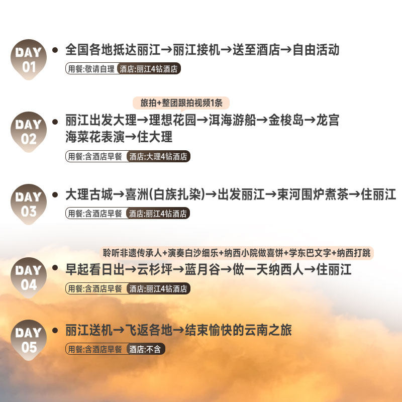 杭州作为数字经济高地,职场人常需短途高效出行。本产品提供杭州直飞丽江的优质航线,5天4晚深度游避开常规旅游团路线,专注人文与自然融合体验。无论是东巴文字探秘还是洱海边旅拍,都能在不打乱工作节奏的前提下,享受一段真正属于自己的宁静时光。