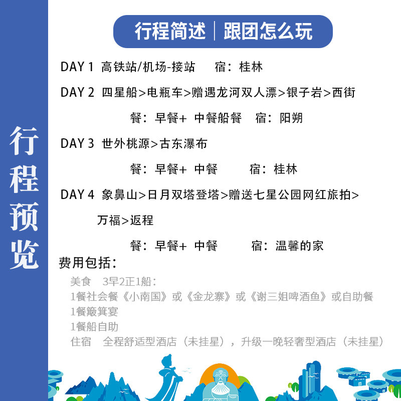 4天3晚行程浓缩桂林-阳朔-龙脊核心景观:漓江四星游船、遇龙河竹筏漂流、银子岩、象鼻山、日月双塔、古东瀑布、龙脊梯田等一网打尽。差旅时间宝贵,本线路科学规划动线,避免重复折返,最大化利用每一分钟,实现深度与效率兼得。