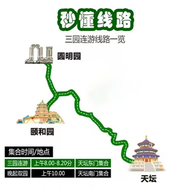 专为商务差旅人士设计的北京圆明园+颐和园+天坛公园一日游线路,科学规划动线,三大世界文化遗产景点无缝衔接,全程不走回头路。无论您是上午抵达还是傍晚返程,都能在有限时间内高效打卡北京最具代表性的皇家园林与祭祀圣地,兼顾文化深度与行程效率,让差旅间隙也能沉浸式感受古都魅力。