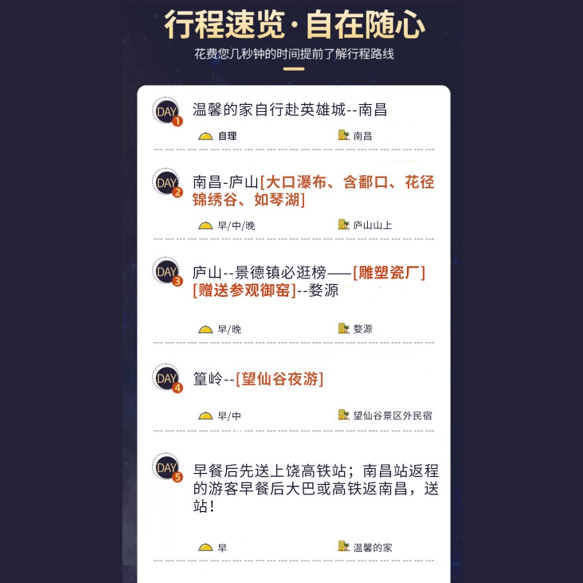 本线路巧妙整合江西四大IP:南昌英雄城起点、庐山云雾山水、景德镇千年瓷都、篁岭晒秋古村、望仙谷仙侠夜景,形成‘自然+人文+民俗+夜游’的立体化差旅体验。5天时间浓缩赣鄱文化精髓,避免重复奔波,特别适合希望在有限时间内高效领略地域特色的差旅人群,真正做到‘一程看尽江西美’。