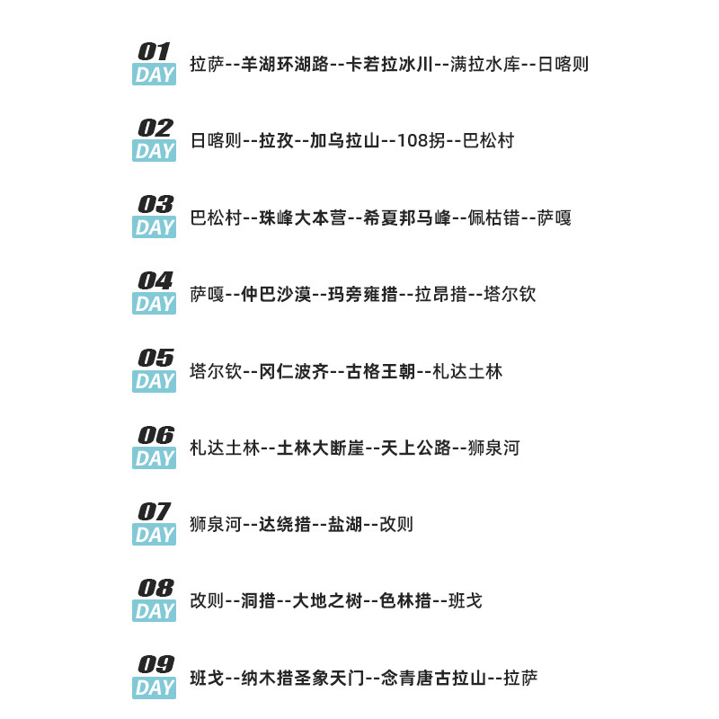 针对年假有限或周末+年假组合的差旅人群,9天行程科学规划,避免冗长交通耗时,每日车程控制在合理范围,确保游览质量。从拉萨出发并返回,形成闭环路线,便于衔接航班,高效利用宝贵的休假时间。