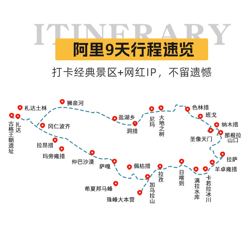 本线路专为差旅人士设计,从拉萨高效出发,9天内串联阿里、日喀则、山南、那曲四大区域,涵盖冈仁波齐、珠峰大本营、羊卓雍措、纳木措等西藏核心景点。行程紧凑但节奏合理,避免重复折返,节省差旅时间成本,同时满足商务出行后的深度度假需求,实现工作与休闲的无缝切换。