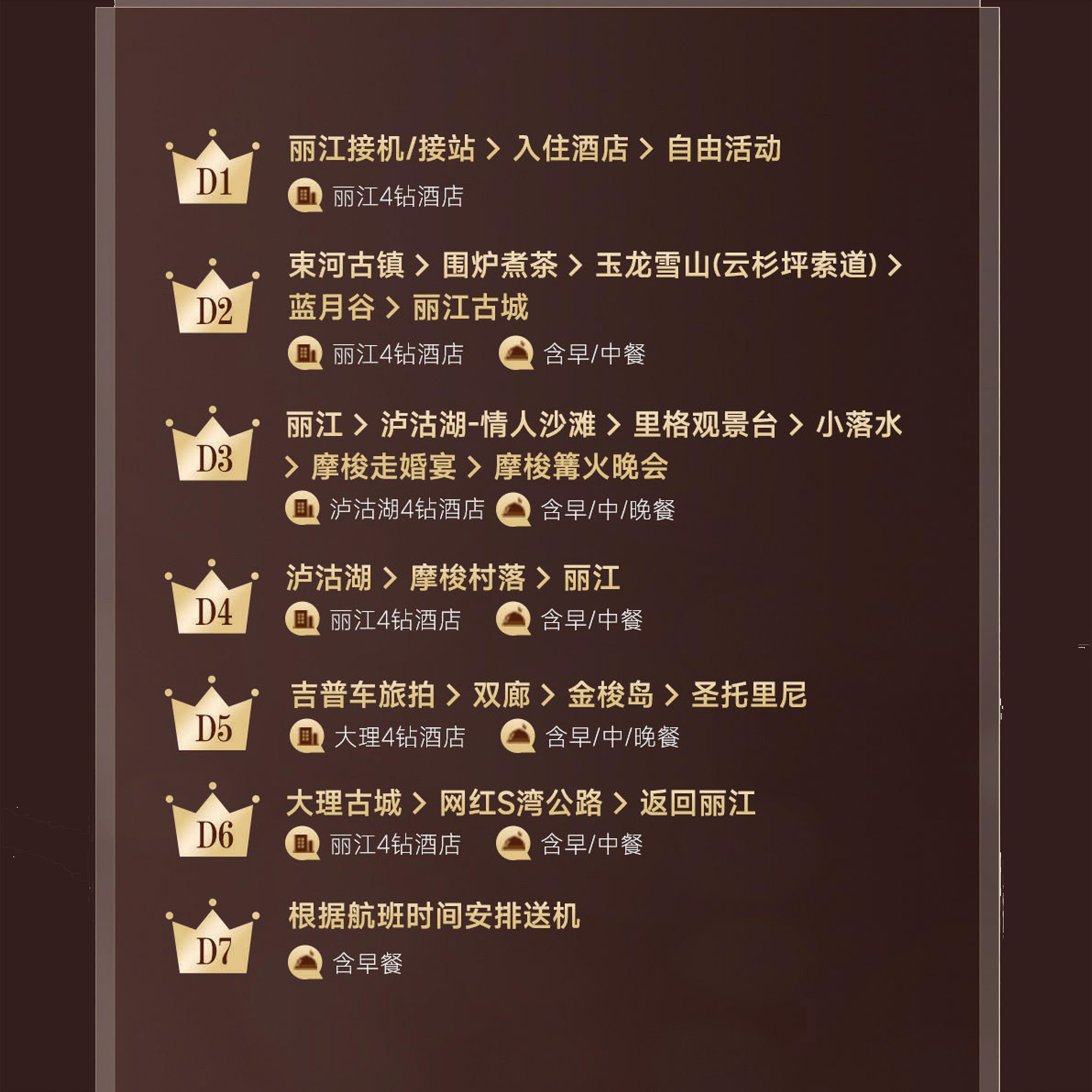从丽江出发,经玉龙雪山、泸沽湖,再延伸至大理双廊,行程科学串联云南两大热门目的地,避免重复交通耗时。专为差旅人群优化动线,减少无效奔波,确保在有限时间内高效覆盖自然风光与人文景观。无论是雪山索道、洱海旅拍,还是古城漫步,皆可一站式体验,实现差旅与度假的完美平衡。