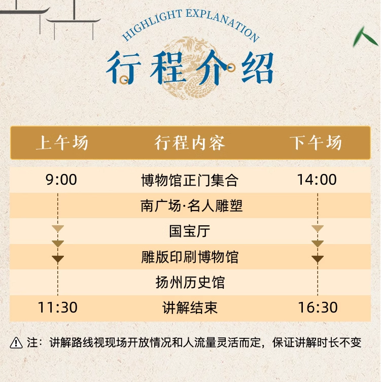 告别走马观花式参观,本产品配备橄榄游认证金牌导游,提供2小时高强度、高信息密度的人工讲解。导游深谙差旅人士需求,语言精练、重点突出,结合扬州本地历史与双博馆镇馆之宝,快速构建文化认知框架。即使只有午休或傍晚的短暂空档,也能完成一次深度文化沉浸,为繁忙差旅注入精神养分。