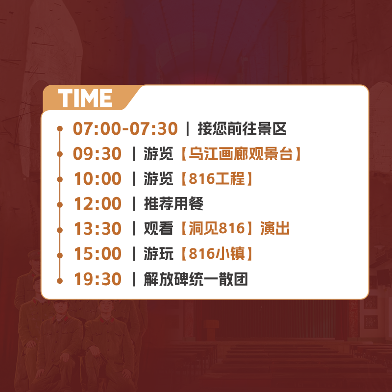 行程包含备受好评的《洞见816》特色演出,以沉浸式舞台艺术还原三线建设时期的峥嵘岁月。对于差旅人士而言,这不仅是一场视觉盛宴,更是一次深度了解重庆工业历史与民族精神的文化之旅。演出时长适中、节奏紧凑,完美契合差旅人群对高价值文化体验的需求。