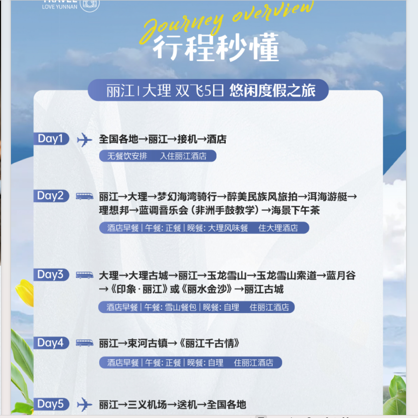 专为时间宝贵的差旅人士优化设计,5天4晚行程涵盖丽江古城、大理洱海、玉龙雪山等核心景点,剔除冗余环节,确保每一分钟都物有所值。从济南、太原、沈阳等北方城市出发,利用周末加两天年假即可完成一次高质量跨省度假,既满足探索欲,又不影响下周工作节奏。