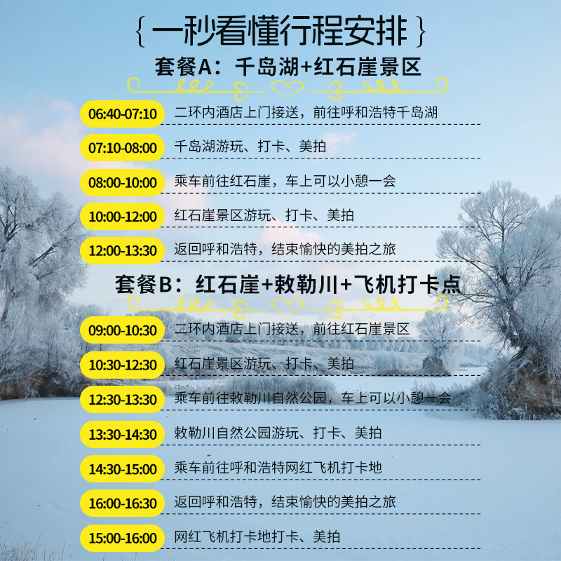 针对差旅人士时间碎片化的特点,本产品设计为一日往返行程,早上出发、傍晚返回,无缝衔接呼和浩特本地会议或高铁班次。无需额外请假或调整工作计划,即可享受完整度假体验。行程节奏张弛有度,既避免过度疲劳,又充分释放压力,是高效差旅生活的理想补充。