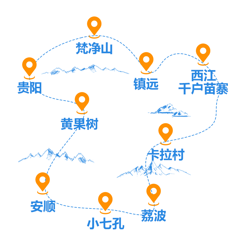 以贵阳为起点和交通枢纽,本线路科学规划行车路线,避免重复折返,节省宝贵时间。从省会城市出发,依次前往安顺(黄果树)、黔南(小七孔)、黔东南(千户苗寨、镇远)、铜仁(梵净山),形成顺时针环线,每日车程控制在合理范围内。对差旅人士而言,既能高效打卡多个目的地,又不至于过度疲劳,实现‘少走路、多看景’的理想状态。