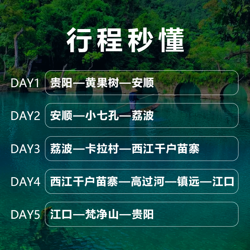 本行程专为差旅人士设计,从贵阳出发,覆盖黔东南、安顺、铜仁、黔南等贵州核心旅游目的地,5天4晚紧凑安排,适合利用周末或短假期出行。1人即可成团,无需等待多人拼团,极大提升差旅效率。行程涵盖黄果树瀑布、小七孔、千户苗寨、镇远古镇及梵净山等世界级景点,兼顾自然风光与民族文化体验,让商务之余也能深度放松身心。