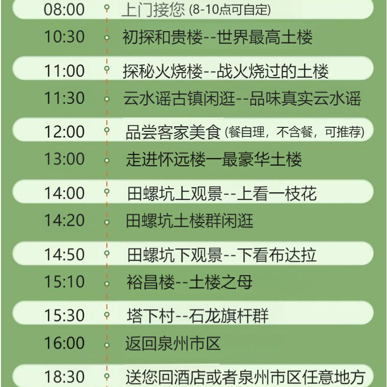 针对独自出差或临时起意的旅行者,本产品支持1人成团,无需拼团等待。专属车辆与向导全程陪同,保障安全与隐私,特别适合注重效率与舒适度的商务人士。您可自由掌控节奏,在云水谣古道漫步、在土楼王前留影,享受不被打扰的深度人文之旅,让短暂差旅时光也能充满诗意与回忆。