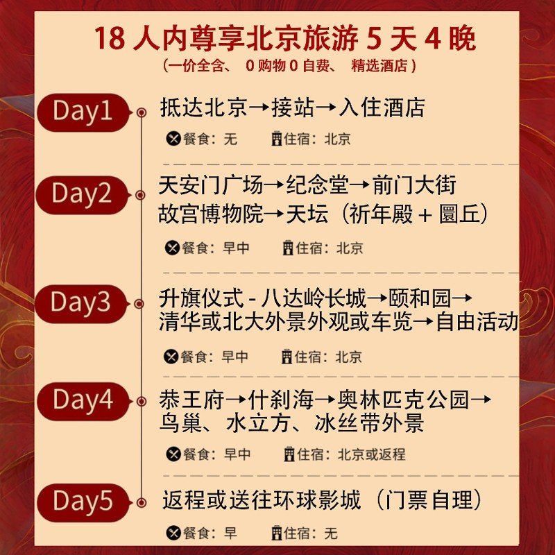 本行程专为差旅人士设计,支持1人独立成团,无需等待拼团,极大提升出行灵活性。无论是临时出差后的短暂停留,还是结合商务会议的深度文化体验,都能轻松安排。5天4晚的紧凑行程涵盖升旗、故宫、长城、颐和园等核心景点,兼顾效率与深度,让您的差旅时光兼具工作与休闲价值,实现真正的“商旅融合”。