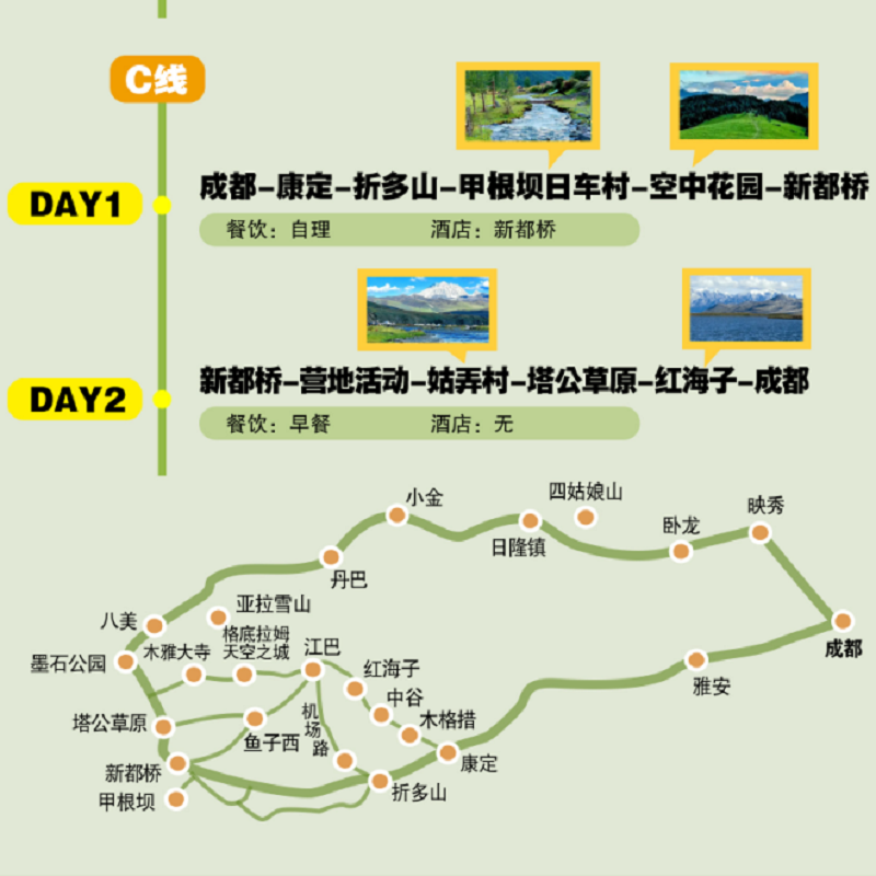 从成都市区出发,当天即可抵达甘孜新都桥、甲根坝等核心景区,无需多日奔波。行程设计充分考虑差旅人士的时间成本,2日游安排紧凑合理,既能欣赏“摄影天堂”新都桥、“空中花园”等绝美风光,又不影响后续工作安排,实现高效度假。