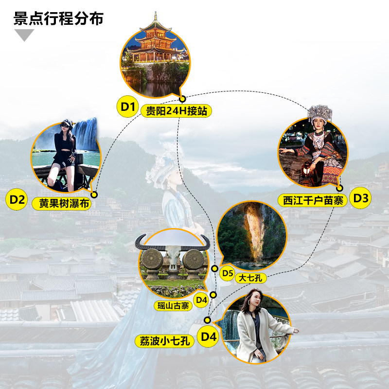 行程精心设计,从贵阳出发,高效串联安顺(黄果树瀑布)、黔东南(西江千户苗寨)、黔南(小七孔、瑶山古寨)三大特色区域,5天4晚内完成多点深度游。对差旅人士而言,这意味着一次出行即可领略喀斯特地貌、苗侗文化、古村古镇等多元风貌,最大化利用有限假期。路线规划合理,减少无效交通耗时,确保每段旅程都充实而高效。