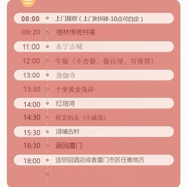 专为商务差旅人士设计,从厦门市区便捷出发,无缝衔接泉州人文精华景点。全程包车服务,无需换乘、不浪费时间,早上出发傍晚返回,最大化利用碎片化时间。无论是会议间隙还是项目收尾后的放松,都能在一天内深度体验闽南文化,兼顾效率与休闲,是差旅途中理想的一日微度假选择。