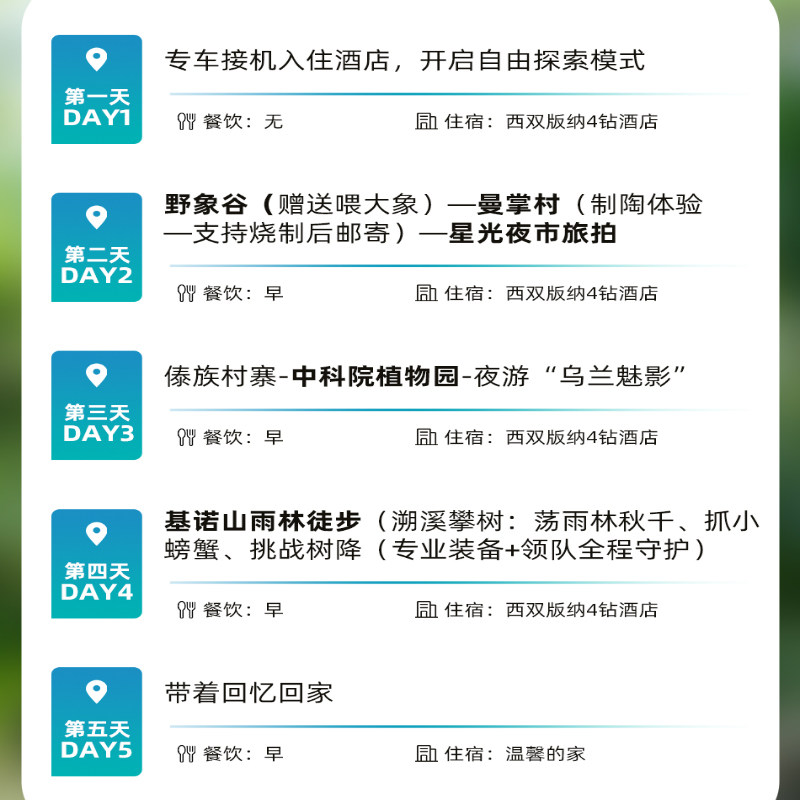 针对经常独自出差的职场父母,本产品支持单人预订,无需拼团等待,随时成行。您可在完成工作任务后,直接带孩子开启5天4晚的西双版纳深度亲子游。行程安排紧凑而充实,既满足高效差旅需求,又确保高质量亲子陪伴时光,特别适合临时调休或利用年假快速切换工作与生活模式的都市人群。