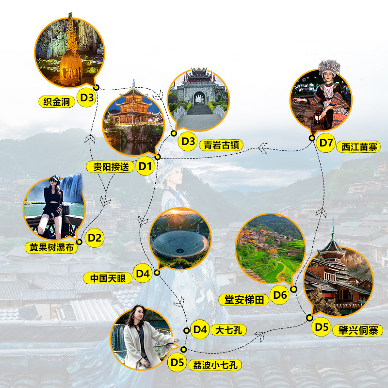 精心规划的差旅友好型路线,7天内高效串联黄果树瀑布(亚洲最大瀑布)、荔波小七孔(地球绿宝石)、西江千户苗寨(全球最大苗族聚居村寨)及肇兴侗寨(侗族文化活态博物馆)。全程交通衔接顺畅,减少无效耗时,最大化利用有限假期,满足差旅人士对‘短时高效、深度体验’的核心需求。