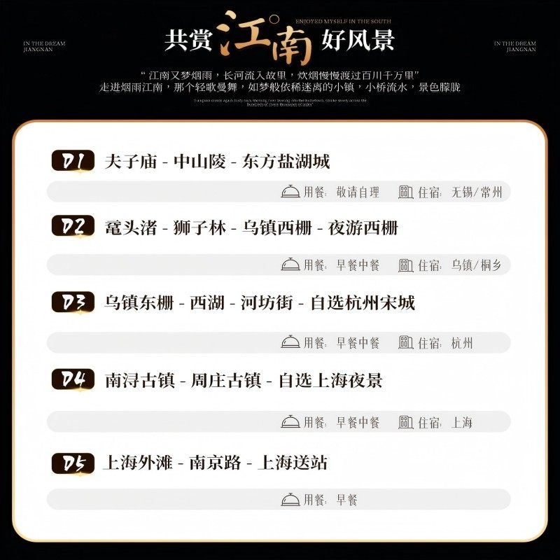 本线路专为从南京出发的差旅人士设计,高效串联上海、苏州、杭州、乌镇及嘉兴等核心城市,行程节奏张弛有度,兼顾商务与休闲。高铁网络发达,城市间通勤便捷,节省宝贵时间;同时融入夜游秦淮、乌镇西栅等文化体验,让差旅之余也能沉浸于江南水乡的诗意氛围中,实现工作与度假的完美平衡。