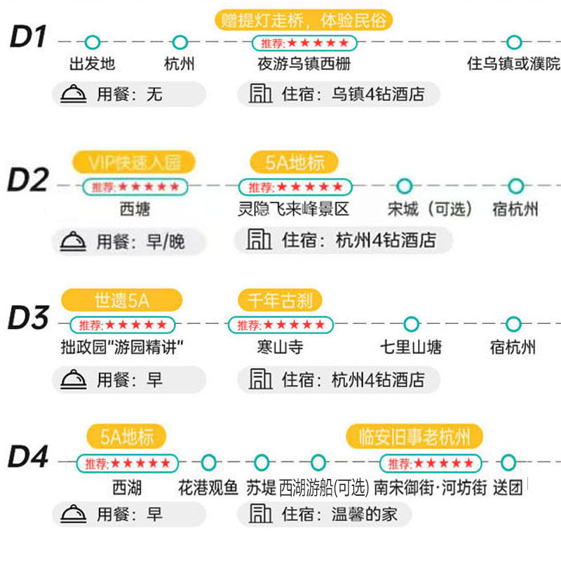 区别于传统旅游团的冗长购物环节,本行程承诺“真纯玩”,全程无任何强制购物或隐形消费,特别适合时间宝贵的差旅人士。4天行程聚焦乌镇西栅、南浔、西塘、苏州园林及杭州西湖等精华景点,每一站都经过精心筛选,确保在有限时间内获得最大化的文化沉浸与视觉享受,让您的差旅假期真正回归放松与探索的本质。