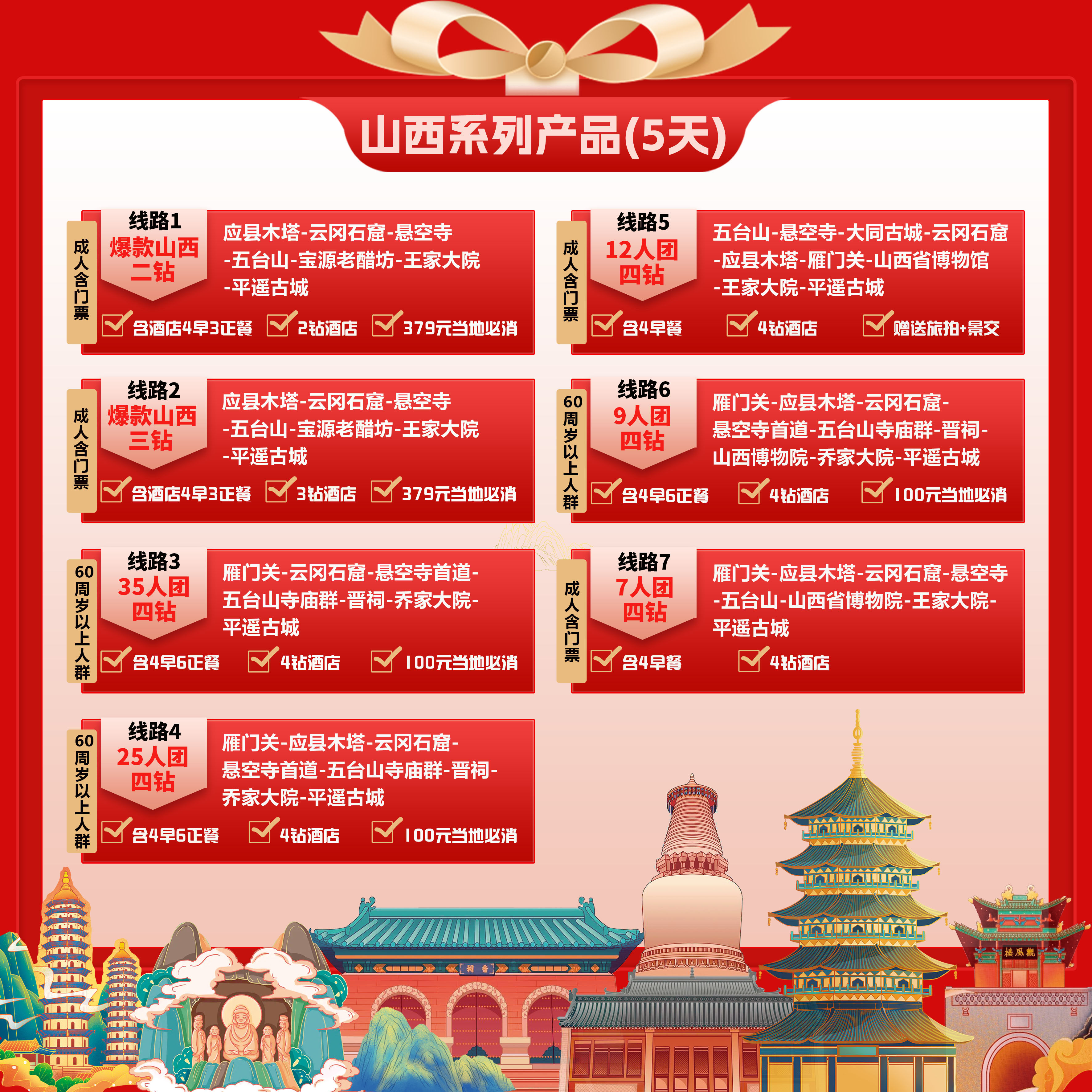 以“人文旅行”为核心主题,5天4晚行程逻辑严密:D1太原晋祠启程,D2五台山祈福,D3大同云冈探秘,D4平遥古城穿越,D5返程。每日主题鲜明,避免走马观花,确保差旅人士在碎片化时间中获得系统性文化认知,提升旅行价值感与满足感。