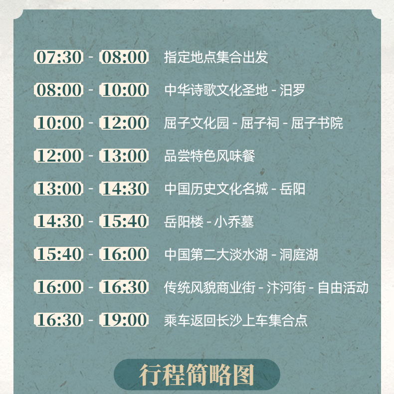 区别于普通观光,本产品以‘屈原文化+三国遗迹+唐宋名楼’为主题脉络,串联小乔墓、岳阳楼、屈子文化园等节点,构建有逻辑、有深度的叙事旅程。差旅人士可在有限时间内系统感知湖湘文脉,避免走马观花,让短暂出行收获持久文化记忆,提升旅行含金量。