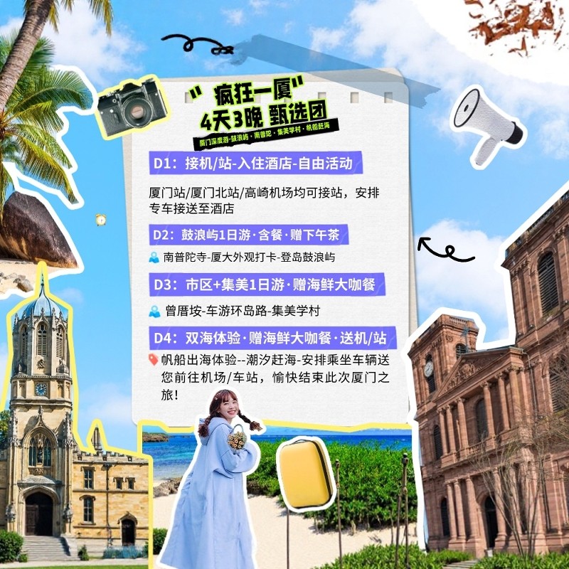 针对从厦门本地出发的差旅人群,省去长途交通耗时,4天3晚即可完成一次高质量微度假。无需舟车劳顿,当日即可登上鼓浪屿,次日扬帆出海。行程紧凑却内容饱满,完美适配周末+年假组合,让差旅间隙也能拥有诗与远方。