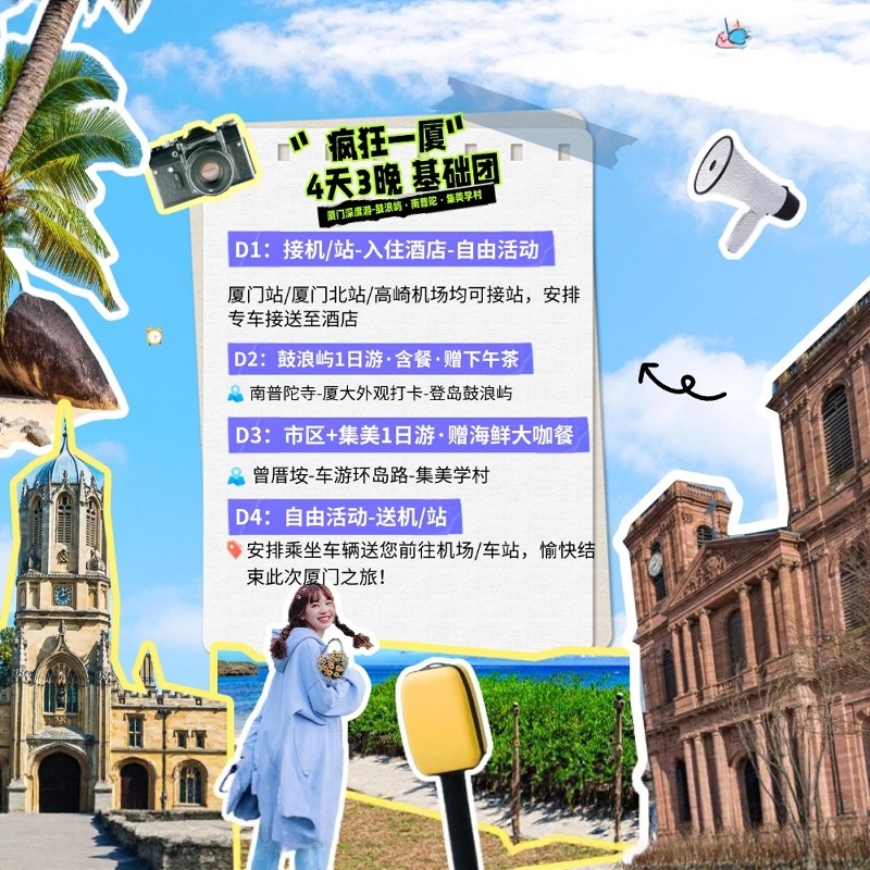 针对独自出差或临时调休的商务人士,本产品支持1人成行,无需拼团等待。行程紧凑却不失松弛感:白天可处理公务,傍晚即刻切换至度假状态——漫步鼓浪屿小巷、登高日光岩俯瞰鹭岛,或参与帆船赶海活动,亲手收获海洋馈赠。三晚连住减少搬运行李烦恼,最大化差旅效率与休闲体验的平衡。