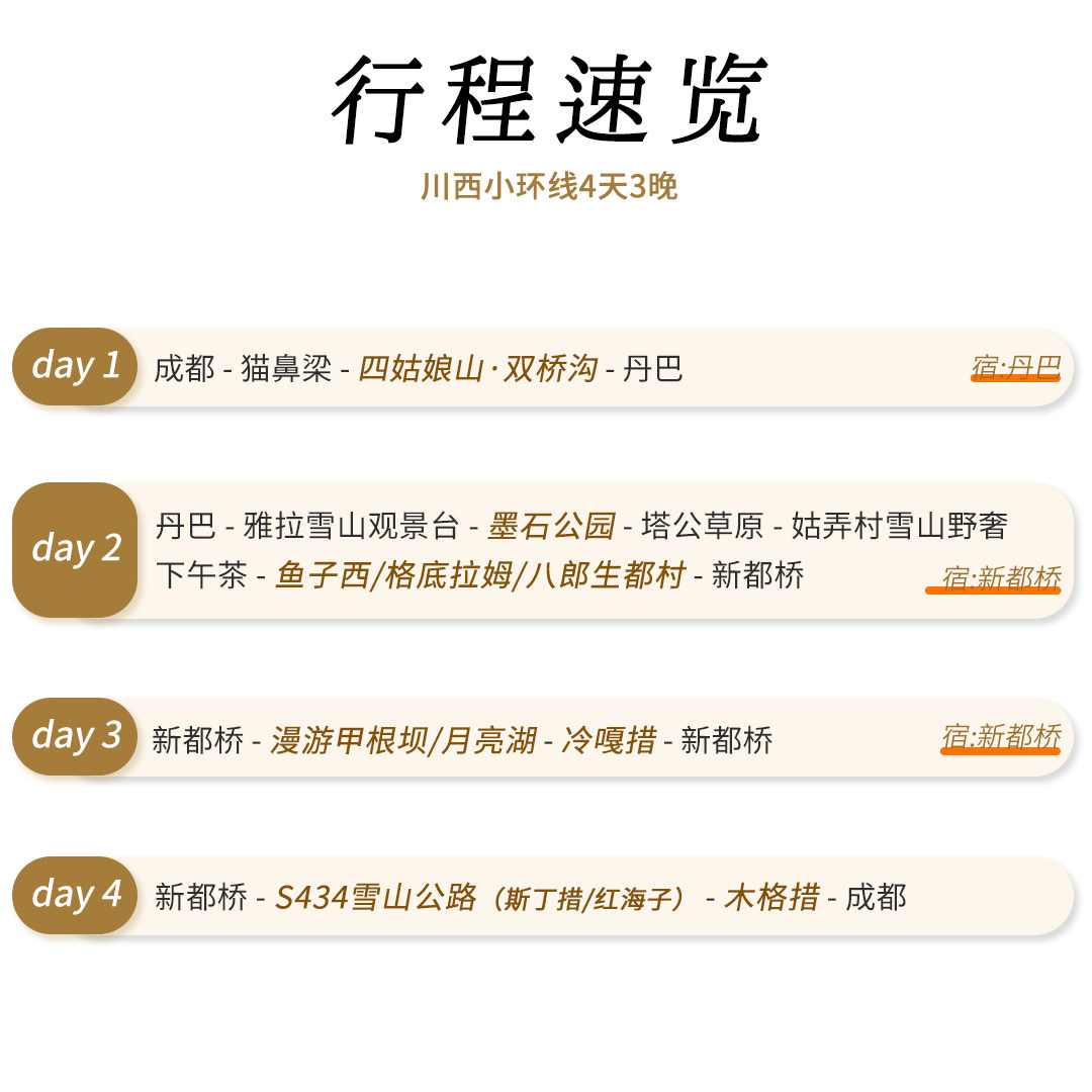 针对差旅人群对私密性与灵活性的高要求,本产品支持2人即可成团,无需拼团等待,行程节奏由您掌控。特别适合商务伙伴结伴出行或情侣差旅度假。专属越野坦克座驾保障高原通行安全,专业司导全程陪同,既满足高效移动需求,又确保旅途舒适。差旅之余,无需协调多人时间,说走就走,真正实现个性化、高品质的川西小环线体验。
