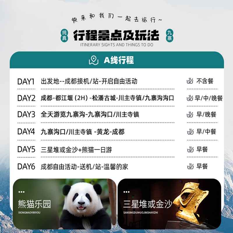 从济南、青岛、烟台、菏泽、临沂等山东主要城市出发,可便捷抵达成都及周边目的地,航班与高铁网络成熟,大幅缩短差旅途中转时间。无论是结束工作会议后即刻开启九寨沟之旅,还是在德阳考察间隙探访三星堆,都能实现高效切换。行程灵活适配1人出行需求,特别适合独自出差的商务人士顺道放松身心,兼顾效率与体验。