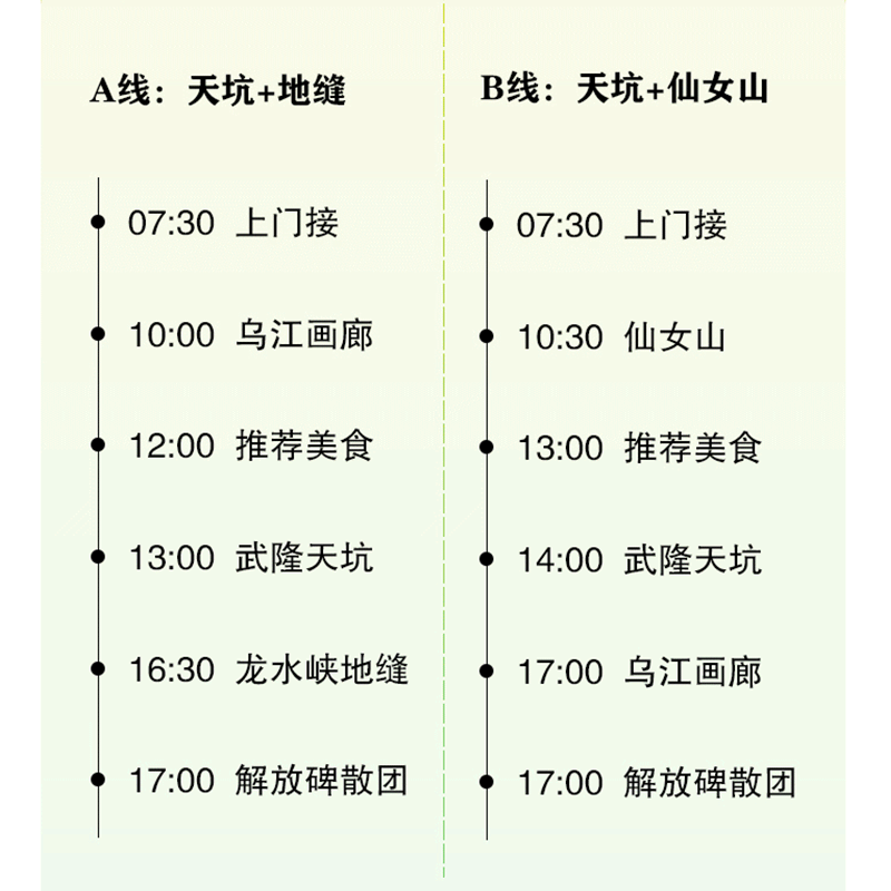 针对差旅人士时间紧张、精力有限的特点,本产品已包含武隆核心景区(天生三桥、天坑地缝、仙女山)所有门票及全程专车接送服务。无需自行预约、排队购票或规划路线,真正实现“拎包即走”的无忧体验,让短暂假期也能高效且充实。