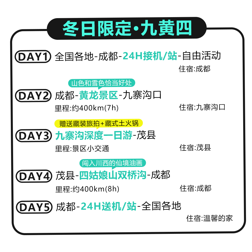 融合“亲子”“旅拍”“温泉”“徒步”等多重主题元素,满足差旅人士在有限假期内的多样化诉求。无论是想带孩子亲近自然,还是希望在黄龙雪山下拍摄一组职场之外的写真,亦或是在四姑娘山脚泡一场室内外温泉,本线路都能一站式满足,让短暂休假变得充实而有意义。