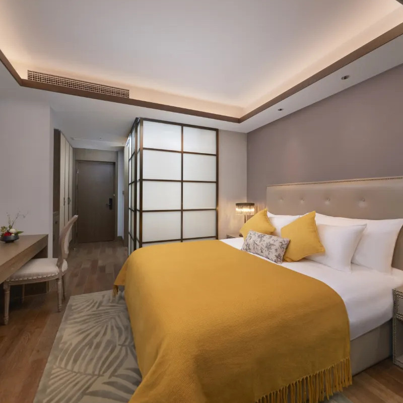 针对可能延长差旅周期的客户,酒店提供LOFT及别墅类房型,拥有独立起居空间与私密庭院,既能满足远程办公需求,又为孩子提供安全玩耍区域。此类房型特别适合需在杭州停留数日的商务人士,将临时住所升级为兼具功能与趣味的家庭基地。
