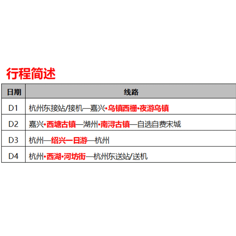 行程科学串联杭州西湖、乌镇、西塘、南浔、绍兴五大经典目的地,避免重复折返,最大化利用有限假期。对于时间宝贵的差旅人士而言,无需自行规划路线、比价交通,全程由专业导游带领,住宿餐饮全包,真正实现‘拎包即走’的高效度假模式,让4天假期发挥最大价值。