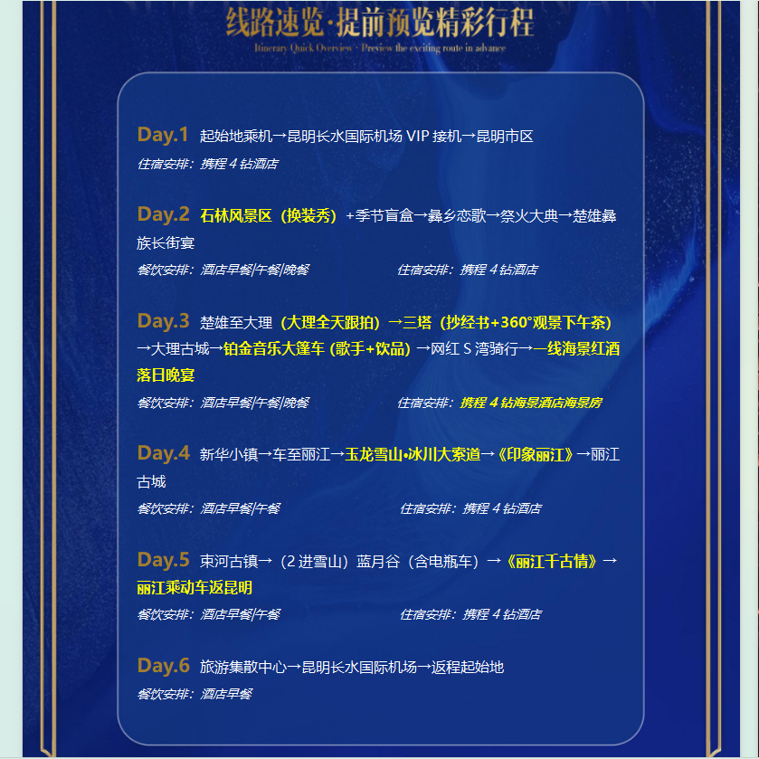 区别于传统观光团,本产品以‘人文旅行+自然奇观’为主题,串联昆明石林、大理洱海、丽江古城与玉龙雪山,形成逻辑清晰、内容丰富的6日动线。差旅人士可在短时间内获得多元体验,避免走马观花,真正实现‘一次出行,多重收获’。