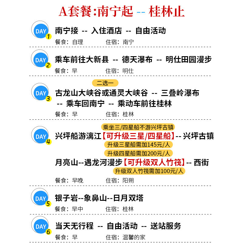 本行程支持从南宁或桂林两地出发,极大便利了差旅人士的行程安排。无论您是结束南宁的商务会议,还是在桂林洽谈合作,均可无缝接入6天5晚的深度度假之旅。无需额外中转奔波,节省宝贵时间,让差旅与休闲自然融合,实现高效出行与身心放松的双重目标。