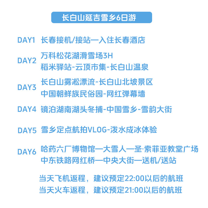 6天5晚行程科学规划,高效覆盖长白山天池、中国雪乡、哈尔滨冰雪大世界等东北标志性景点。对于出差至东北的旅客,无需额外安排行程即可一次性打卡多个世界级景观,最大化利用碎片化假期,实现‘一次出行,多重收获’的差旅度假目标。