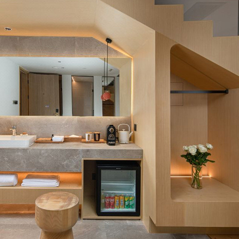 酒店主打LOFT结构亲子主题房,上下层空间巧妙分离休息区与娱乐区,保障父母私密性的同时满足儿童探索欲。房间内融入森林、动物等童趣元素,配备安全防护设施,让带娃出差不再手忙脚乱。高挑空间与全景落地窗更提升居住品质,彰显差旅住宿的精致格调。