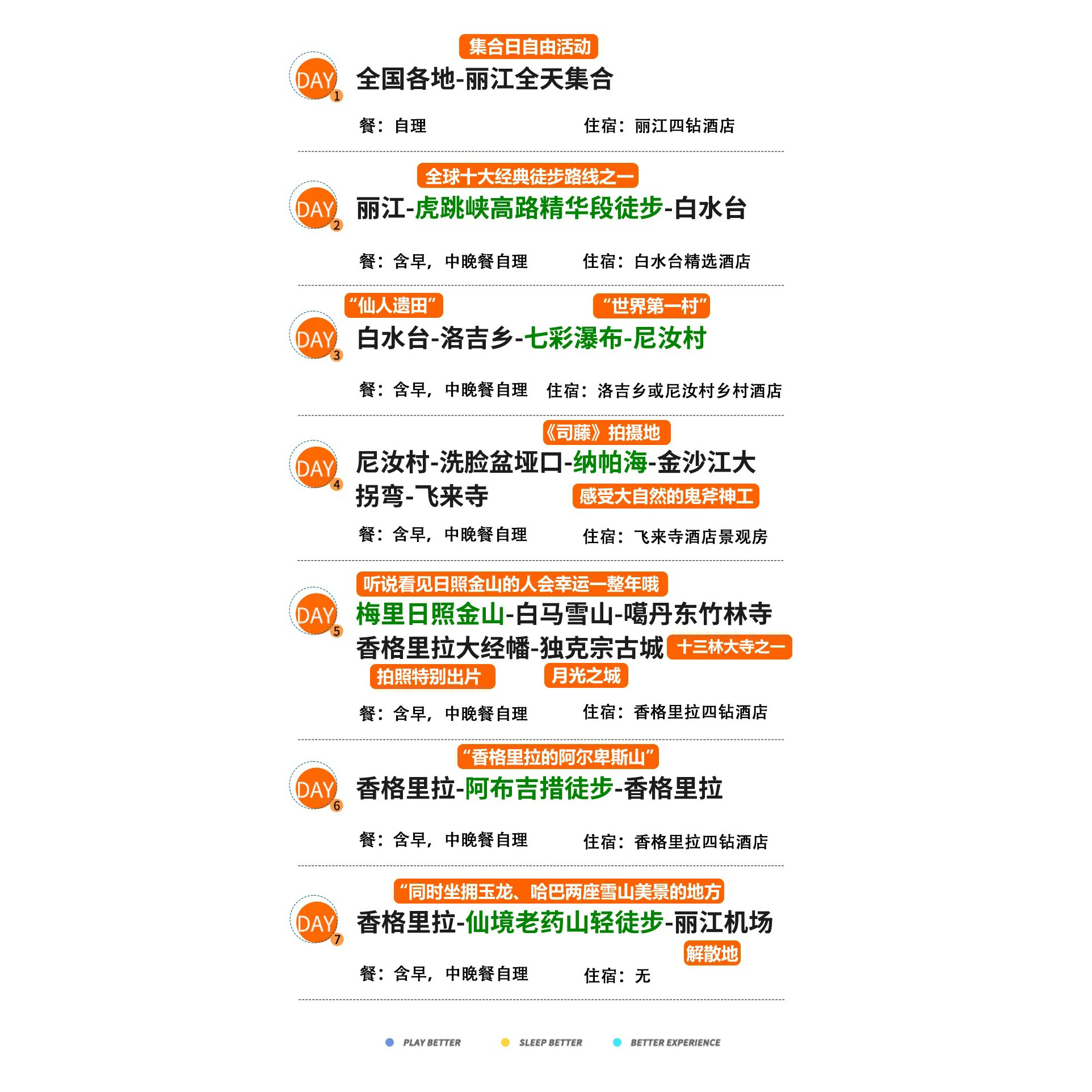 专为时间有限但追求深度体验的差旅人群设计,7日行程高效整合虎跳峡、梅里雪山、尼汝村、老药山、阿布吉措、白水台等云南滇西北精华景点。从高山峡谷到雪山冰川,从古村寺庙到高原湖泊,多样地貌一日切换,满足摄影、文化、自然爱好者多重需求。出差之余,一次旅程收获四季风光,极大提升假期利用效率。