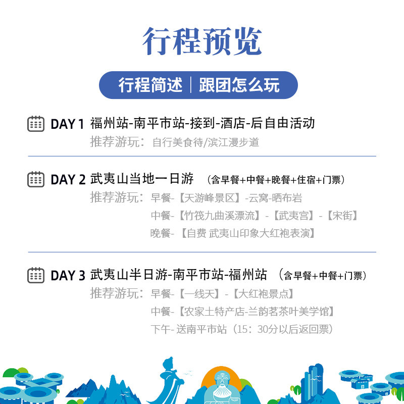 行程根据九曲溪竹筏的实际排班动态调整,体现高度灵活性。考虑到差旅人士常面临航班/高铁时刻变动或临时会议调整,这种非刻板化的日程安排能更好适应不确定性。同时,第三天14:30后送站的设计,也方便衔接返程高铁,避免长时间等待。
