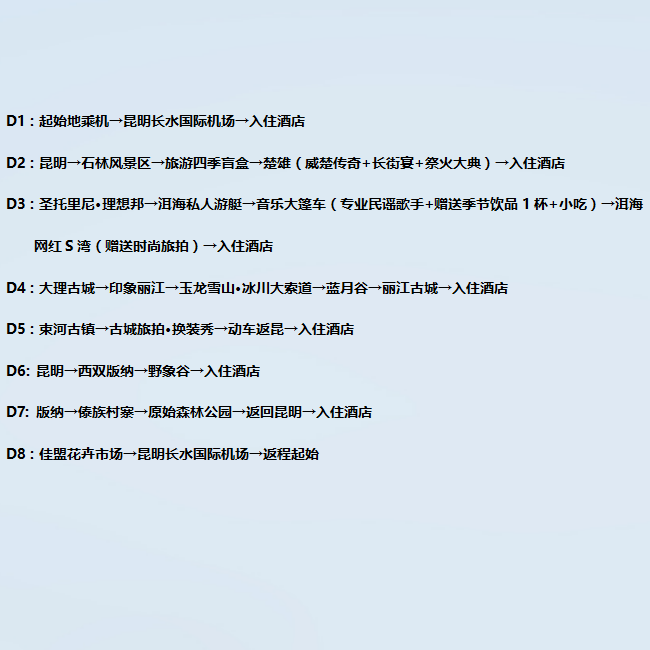 8天7晚的行程长度精准匹配多数企业年假或项目间隙周期,既能深度游览云南四大核心目的地,又不至于过度延长离岗时间。紧凑而不仓促的节奏,配合四钻住宿与纯玩安排,确保差旅人士在有限时间内获得最大化的放松与收获,实现工作与生活的高效平衡。