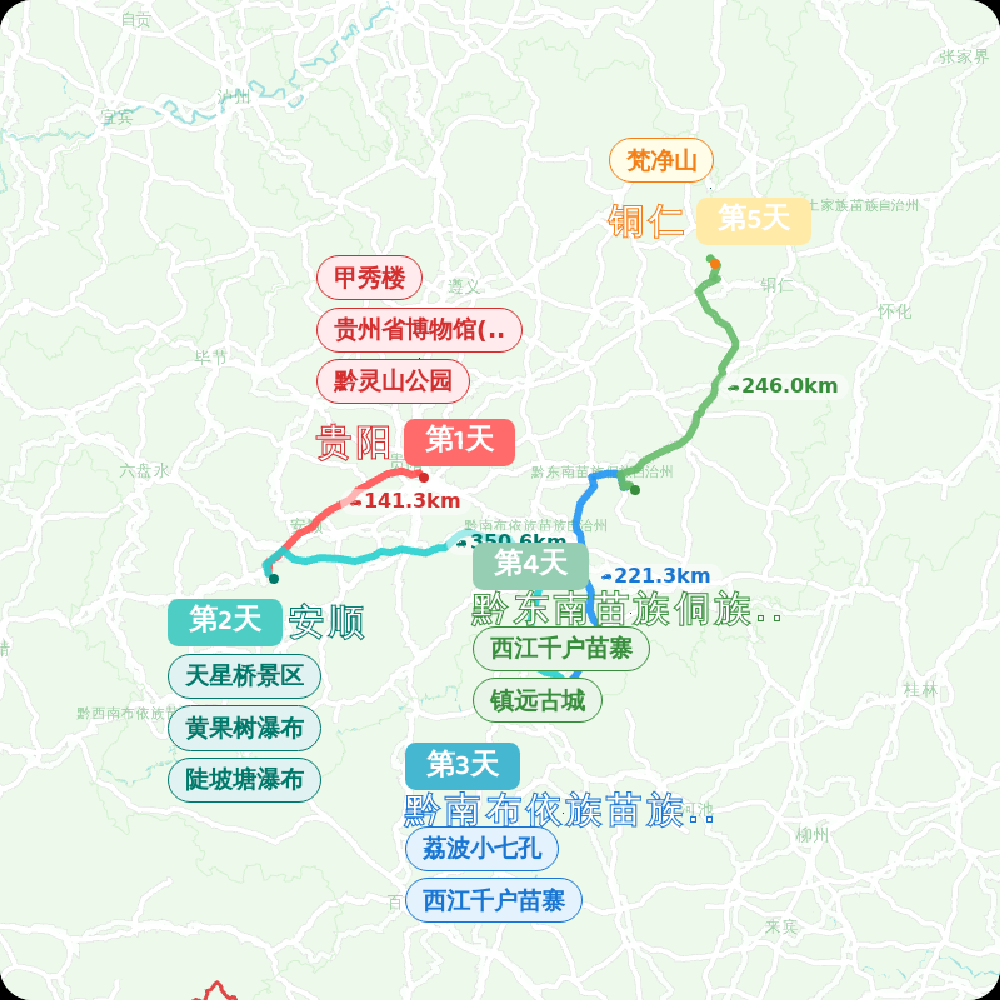 行程巧妙融合自然奇观(黄果树瀑布、梵净山、荔波小七孔)与人文遗产(苗寨、古镇、民族节庆),既适合偏好户外探险的活力型差旅者,也吸引注重文化深度的高知人群。无论是清晨登顶梵净山观云海,还是夜晚聆听苗歌,都能在短时间内获得丰富而多层次的旅行体验,提升假期价值感。