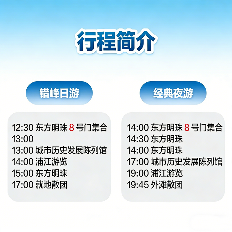 专为时间紧张的差旅人群设计,将上海最具代表性的三项体验——登东方明珠、浦江游船、外滩漫步浓缩于一日之内。全程约6-8小时,可灵活安排在上午或下午,完美适配半天会议或晚间航班前的空档。无需过夜、不占整日,却能带走完整的上海印象,真正实现‘短时高效、深度体验’的差旅度假理念。
