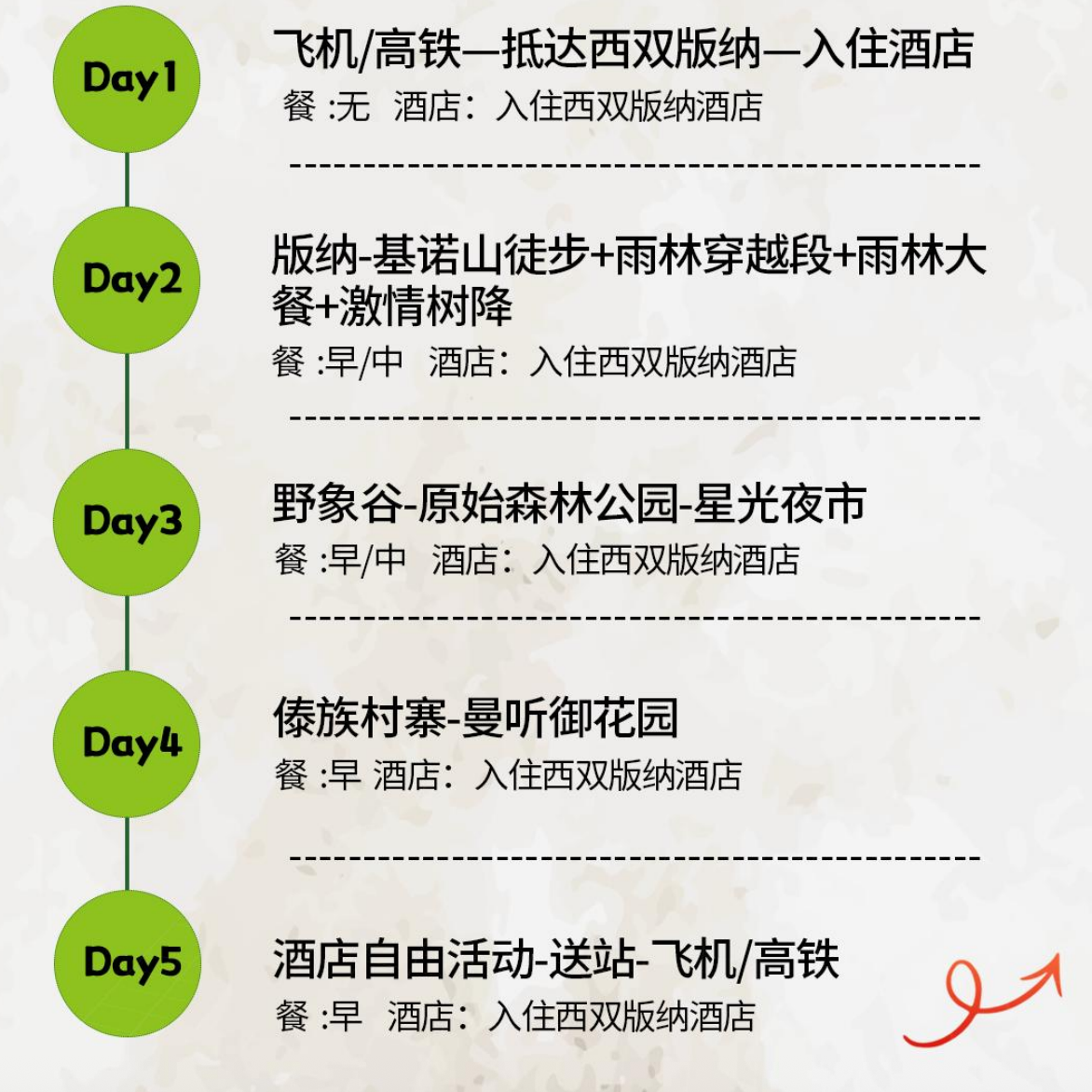 本行程专为兼顾差旅与休闲的旅行者设计,将西双版纳的热带雨林探险与高效私家团服务结合。5天4晚的行程节奏张弛有度,既满足商务人士对时间效率的需求,又提供深度沉浸式的自然体验。基诺山雨林徒步穿越不仅是一次户外挑战,更是一场身心疗愈之旅,途中可享特色雨林餐、探访基诺族文化村落,让差旅不再只是奔波,而是兼具探索与放松的高品质旅程。