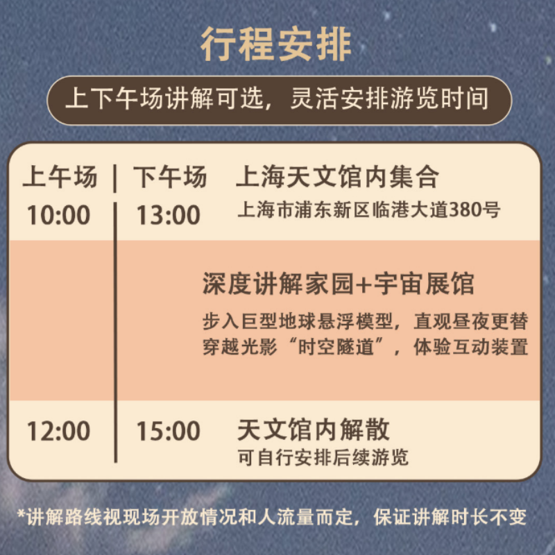 针对差旅人士时间紧张但希望高效利用碎片化假期的需求,本产品提供上海天文馆一日游含门票及专业大咖2小时讲解服务。行程紧凑、内容丰富,无需自行预约排队,省去繁琐流程。特别适合商务出差间隙安排半日或一日休闲体验,既能放松身心,又能获取前沿天文知识,提升差旅附加值。拼团形式灵活,1人即可成行,极大方便独自出差的旅客。