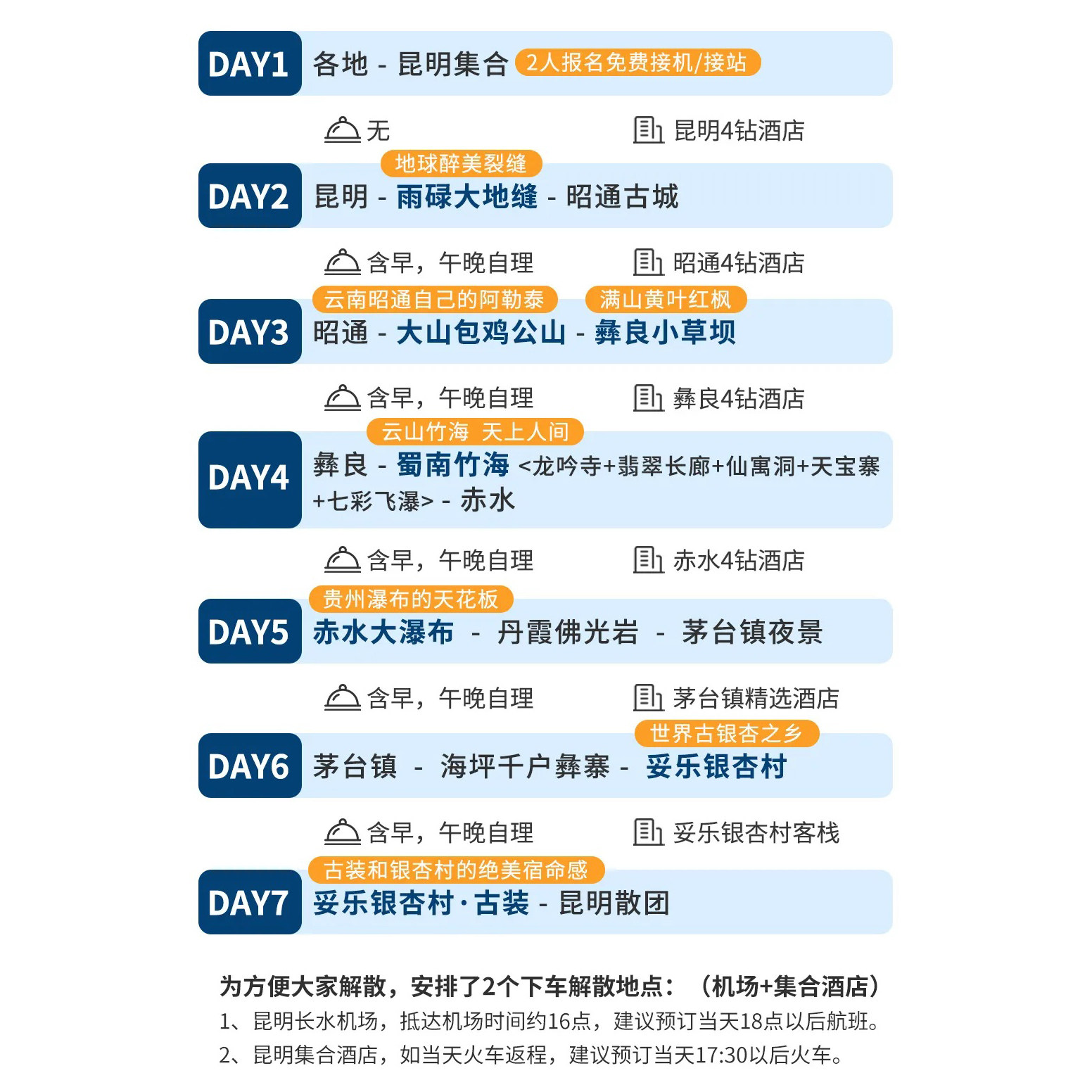 本线路专为独自出行的差旅人士设计,支持1人单独报名且免除自然单房差,极大降低个人出行成本。无论是临时出差间隙的小憩,还是独自探索云贵秋色的周末之旅,您无需凑团、不担心额外住宿费用,轻松开启7日秘境之旅。行程从昆明出发,覆盖贵州遵义、六盘水及四川宜宾等地,兼顾商务与休闲需求,是高效利用碎片化时间的理想选择。