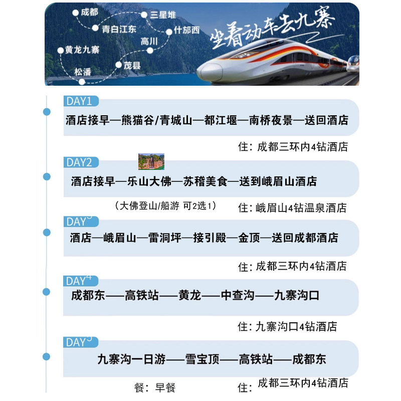 产品采用全包式定价,包含成都往返动车票、4晚特色酒店、所有景区首道门票及当地交通,差旅人士无需逐项比价预订。尤其适合工作繁忙、无暇规划细节的商务客群。一价透明无隐形消费,报销凭证齐全,让度假安排如差旅管理般高效规范,真正实现拎包即走的无忧出行。
