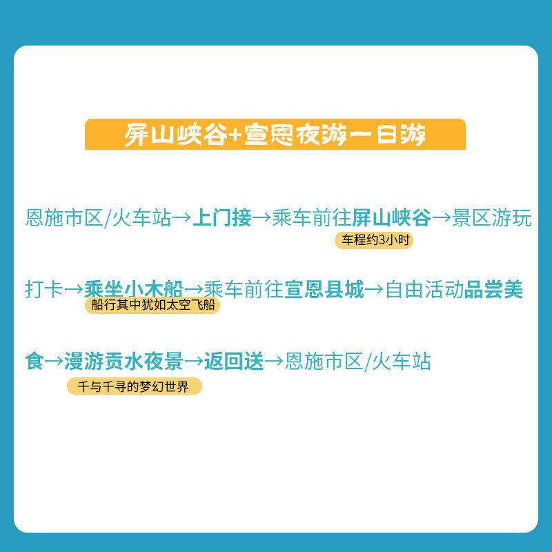 本产品支持1人单独预订,无需拼团等待,特别适合商务出差途中临时安排休闲放松的旅客。无论您是独自出差至恩施,还是会议间隙想快速体验当地精华景点,都能即订即走,节省时间成本,提升差旅效率。行程设计紧凑合理,兼顾自然风光与文化体验,让您的短暂停留也能收获满满回忆。
