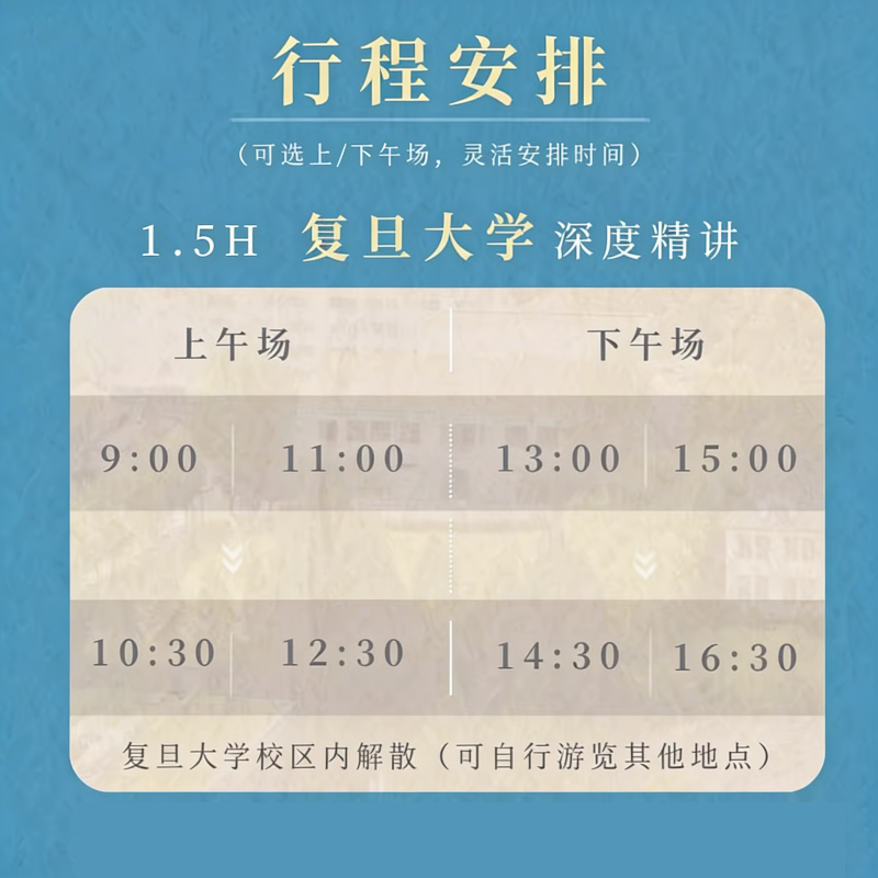 专为商务差旅人士及家庭设计,本产品支持单人预订,灵活适配临时出差或周末短途安排。在上海这座国际化都市中,利用工作间隙或亲子假期,深入中国顶尖学府复旦大学,享受1.5小时专属VIP小包团讲解服务。无需拼团等待,行程高效紧凑,既满足差旅节奏,又融入高质量研学体验,让知识与旅行无缝衔接。