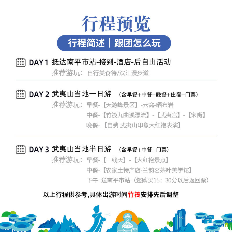 行程首尾两端均安排从南平市站接送服务,无论您何时抵达,当天均可接站入住酒店;返程日14:30后车次均可匹配,充分适配差旅人士的交通时间。全程使用K1线或旅游专车,无缝对接高铁与景区,避免繁琐换乘,节省宝贵时间,让差旅度假更轻松高效。