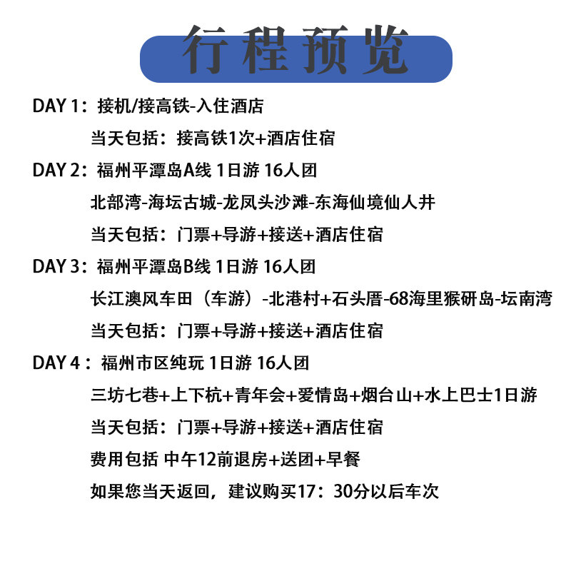 行程精心设计为4天3晚,首日抵达即休整,次日、第三日深入平潭岛自然奇观,第四日回归福州市区人文景点,最后中午退房并安排送站,建议搭乘17:30后车次返程,完美契合差旅人士的时间窗口。全程无购物、纯玩设计,最大化利用有限假期,实现高效放松与文化体验的双重目标。