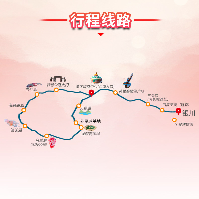 线路覆盖宁夏银川与内蒙古阿拉善两大区域,一次出行横跨两省,体验沙漠、湖泊、戈壁多元地貌。对于需在西北多地开展业务的差旅者,此行程可作为区域考察后的放松延伸,拓宽视野的同时深化对当地人文地理的理解。
